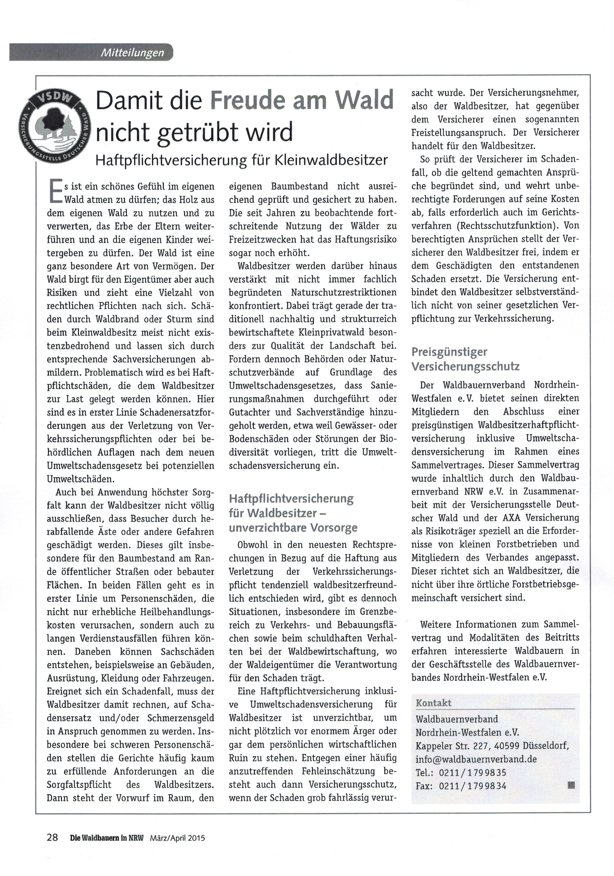 Wir bitten trotzdem ALLE Waldbesitzer zu überprüfen, ob der Abschluss dieser Versicherung für sie vielleicht sinnvoll ist. Sollten diese Versicherungen nicht in Ihrer Betriebshaftpflicht enthalten sein (das betrifft die meisten Privatwaldbesitzer), rufen Sie bitte dringend in unserer Geschäftsselle an, damit wir Ihren Versicherungsschutz überprüfen. Ob Sie eine Versicherung abgeschlossen haben, sehen Sie auf Ihrer letzten Beitragsrechnung. Wenn dort nichts aufgeführt ist, besteht über uns kein Versicherungsschutz.